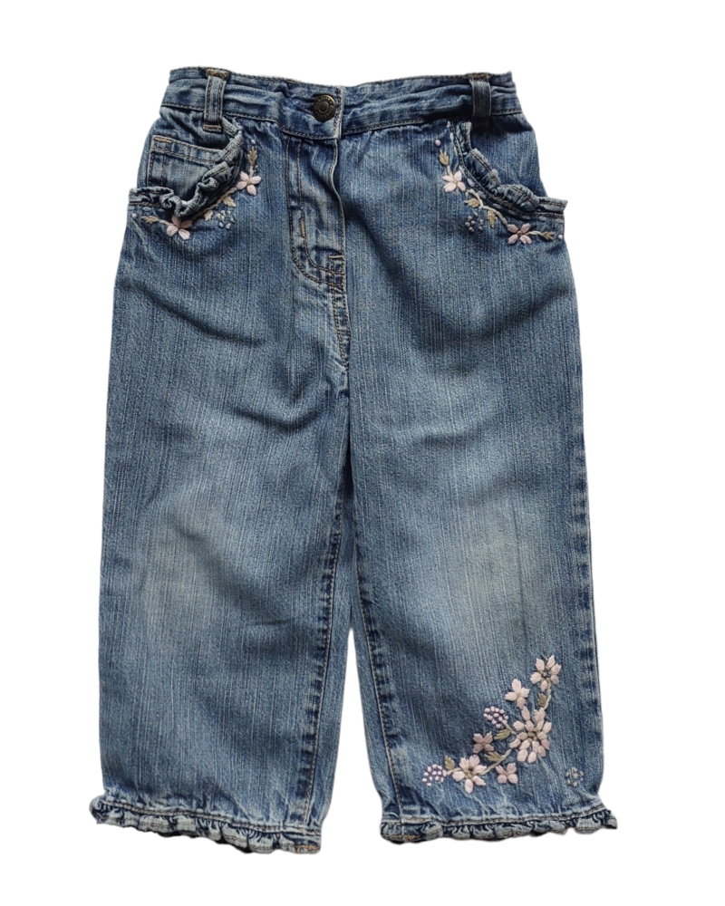 So much detail in these jeans. Frills around cuffs, on hip pockets and back pockets. Embroidery features on hem and pockets and even on inside back waist. Half elastic waist. Top button fly. These jeans will be noticed!