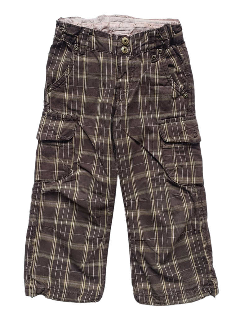 Brown with olive and pink stripes/cheque. Pink lining on waistband and pockets. Adjustable waist with dome and zip fly. Hip, cargo and back pockets. Adjustable Elastic draw cord on cuff and inner tap to hold up.