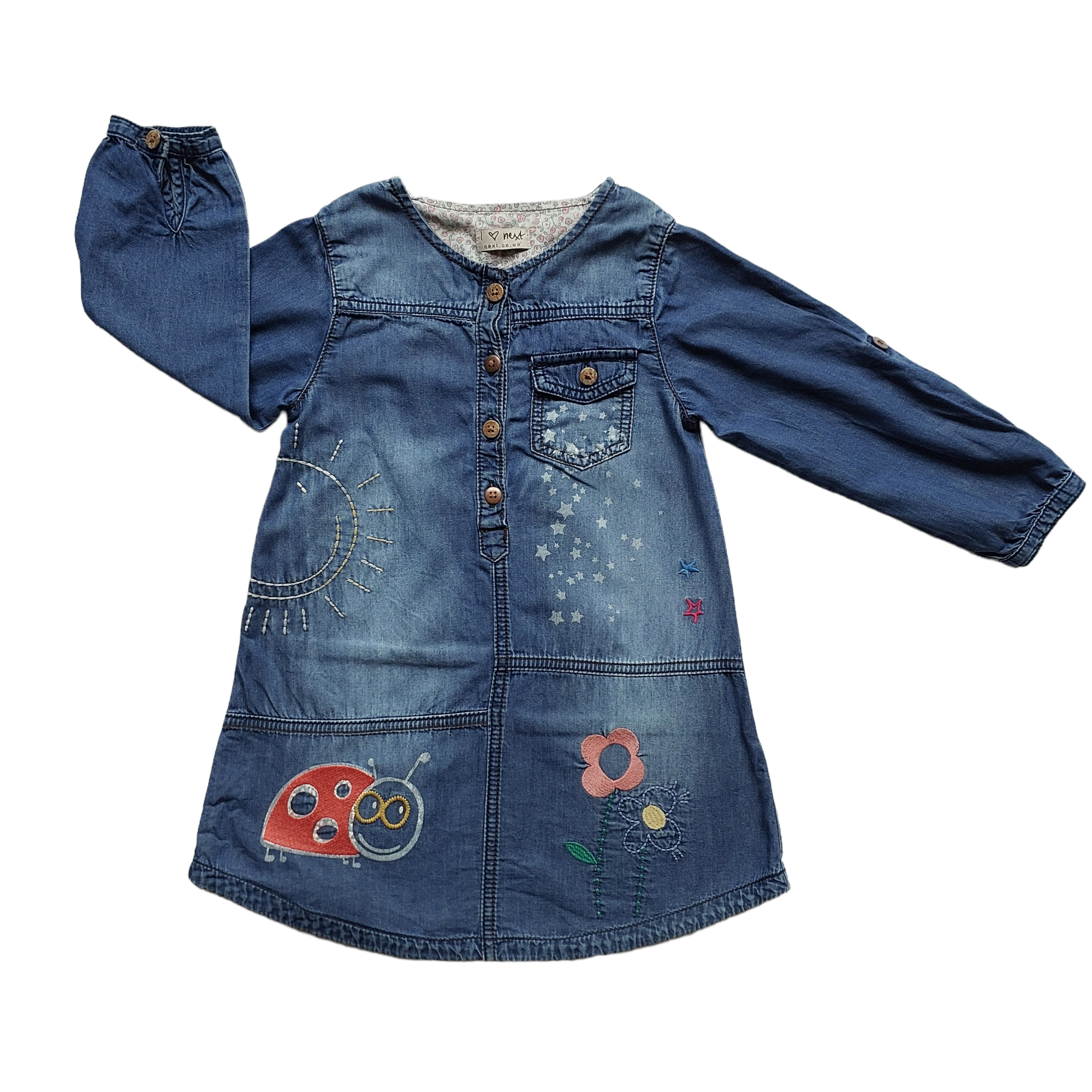 Sleeves have a tab and button for folding up. Ladybird, flower, stars and sun embroidery. Stars and sun on back. Colourful and fun.