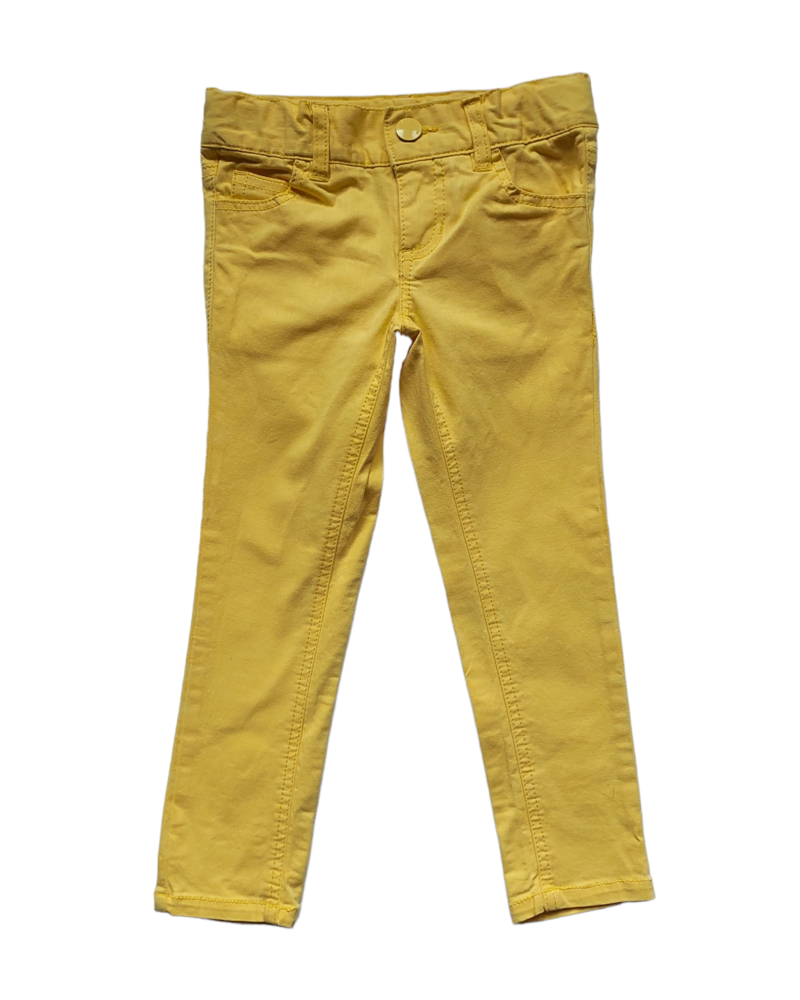 Sunshine yellow. Front and back pockets. Adjustable waist. Button and zip fly.
