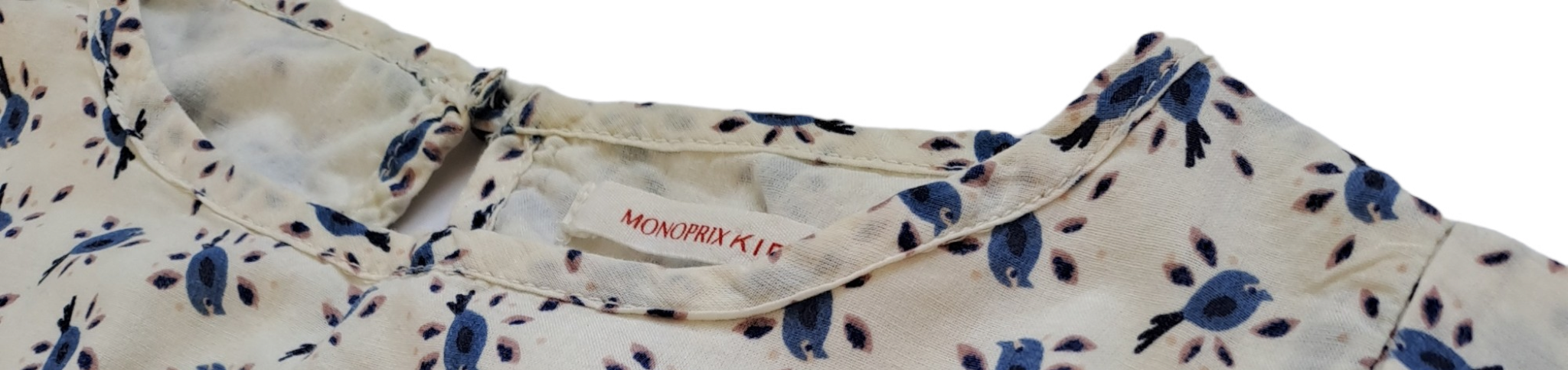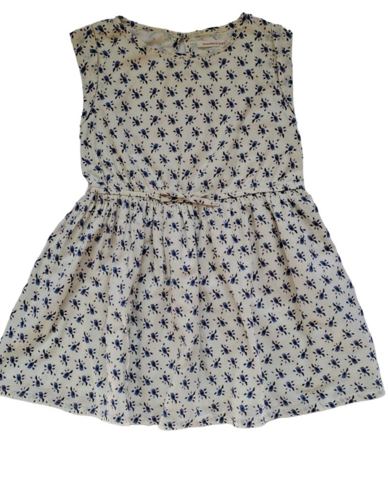 Off white with blue birds. Decorative bow at elastic waist. Lined.